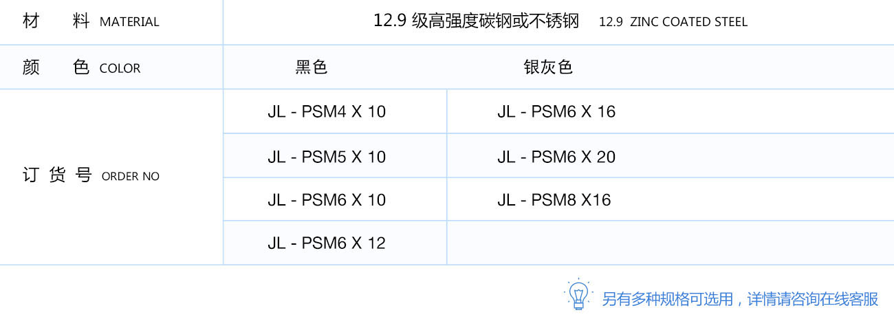 與 T 型螺母配合,常用于合頁、門吸、手柄等裝飾件與型材的連接。
