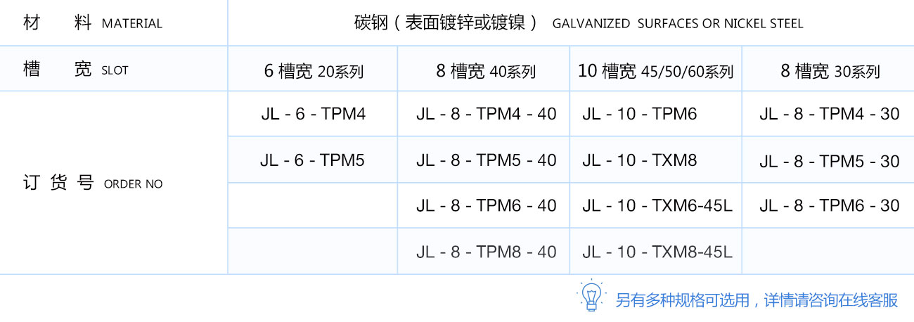 彈片螺母塊能被直接塞進鋁型材槽坑中的任意裝配點,他背部的彈片能撐起并固定它的位置,使安裝十分簡單且可靠,它是型材連接中使用較多的配件之一。